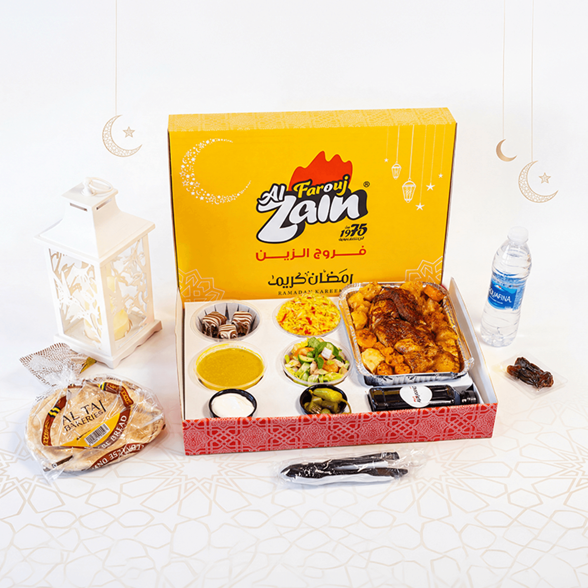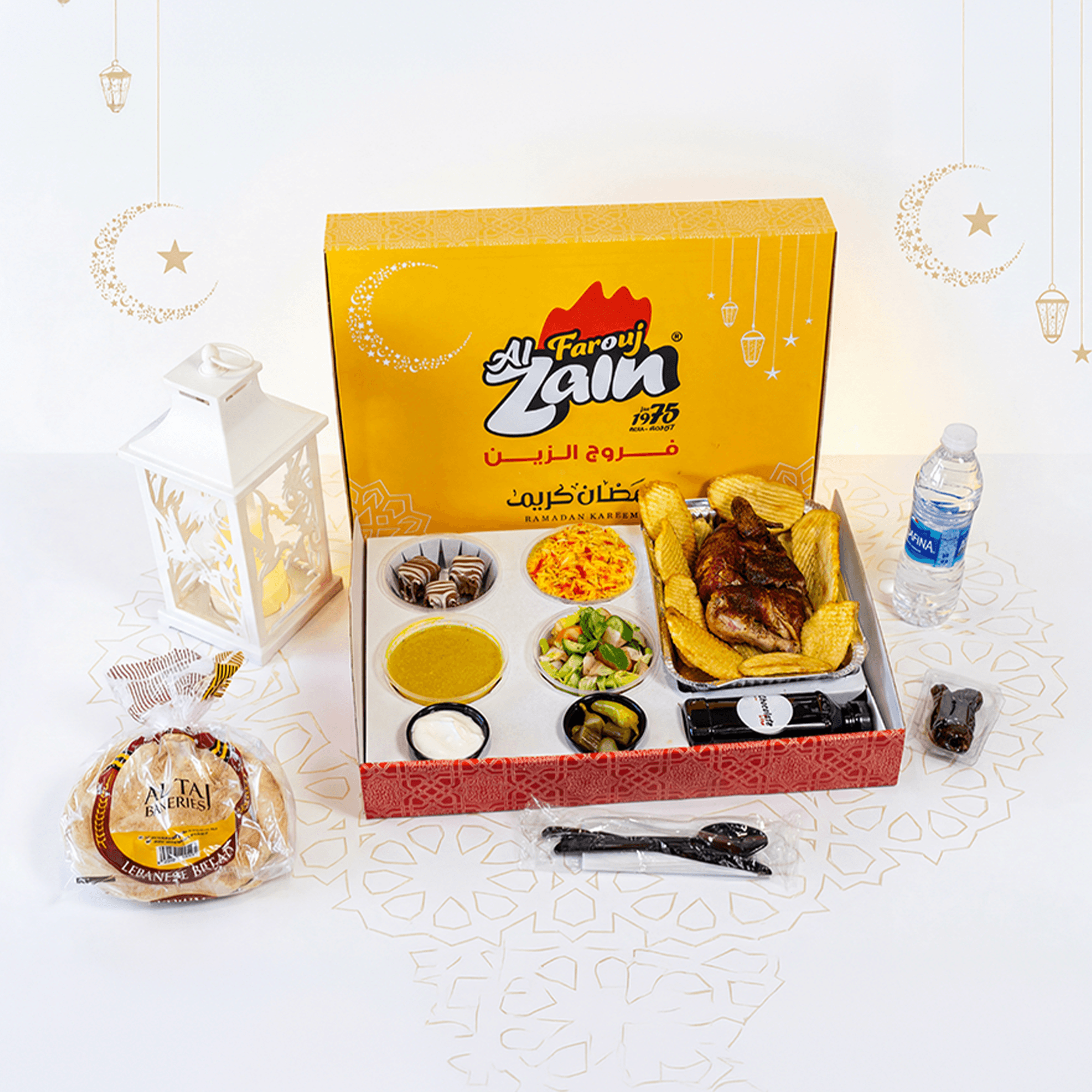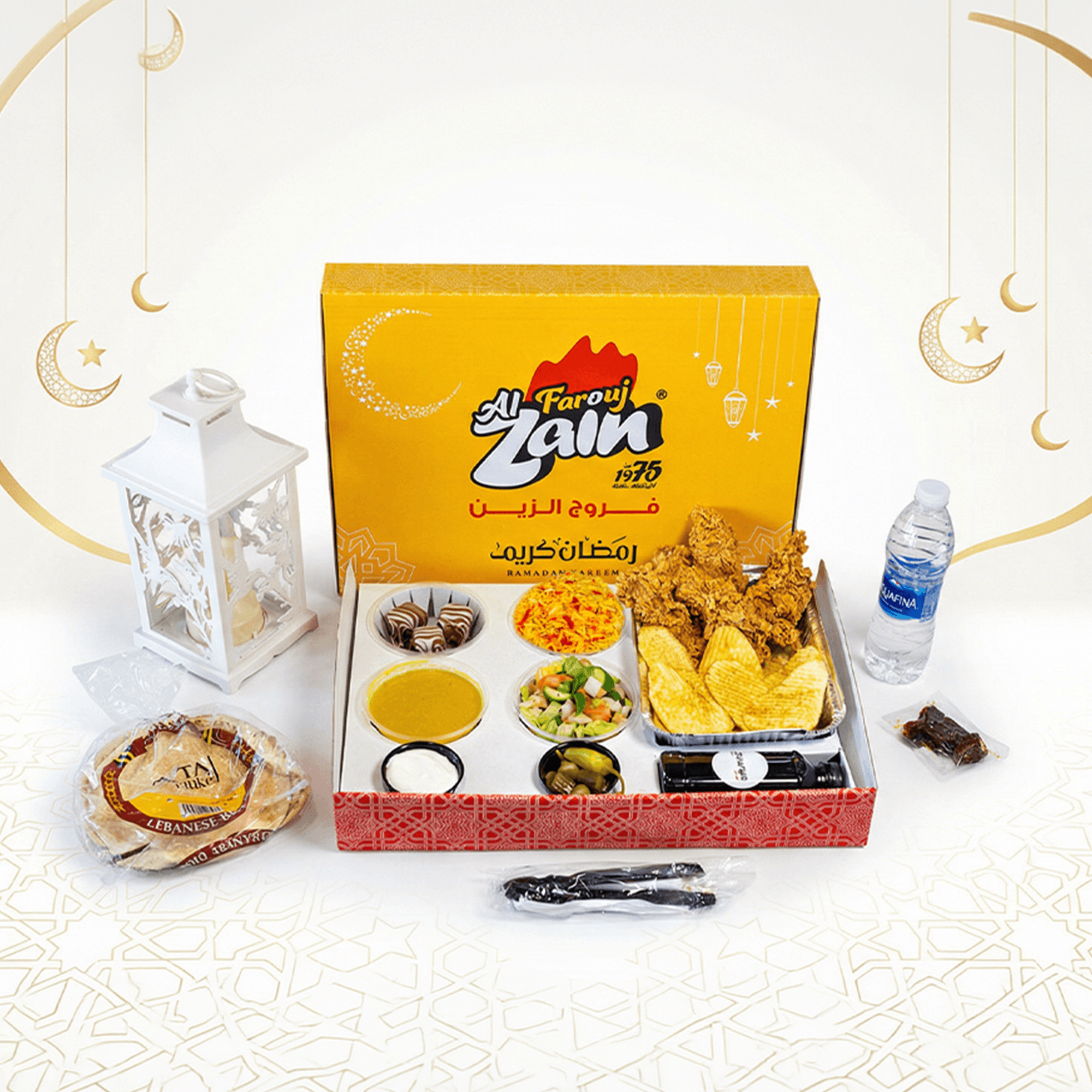 Half Broasted Chicken (4 Pieces), Crispy Potatoes, Rice, Lentil Soup, Arabic Salad, Garlic Cream, Pickles, Lebanese Bread, Dates, Ramadan Juice, and Water Bottle.